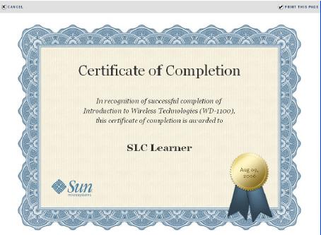 Aquí una pequeña muestra de lo que estos cursos ofrecen. Incluso Sun ofrece certificados por aquellos cursos que se han conseguido finalizar con éxito, como se puede ver en el User Guide (queda por ver, no obstante, cuál es el valor real, o la valoración que puede llegar a tener, un certificado que se descarga y se imprime).